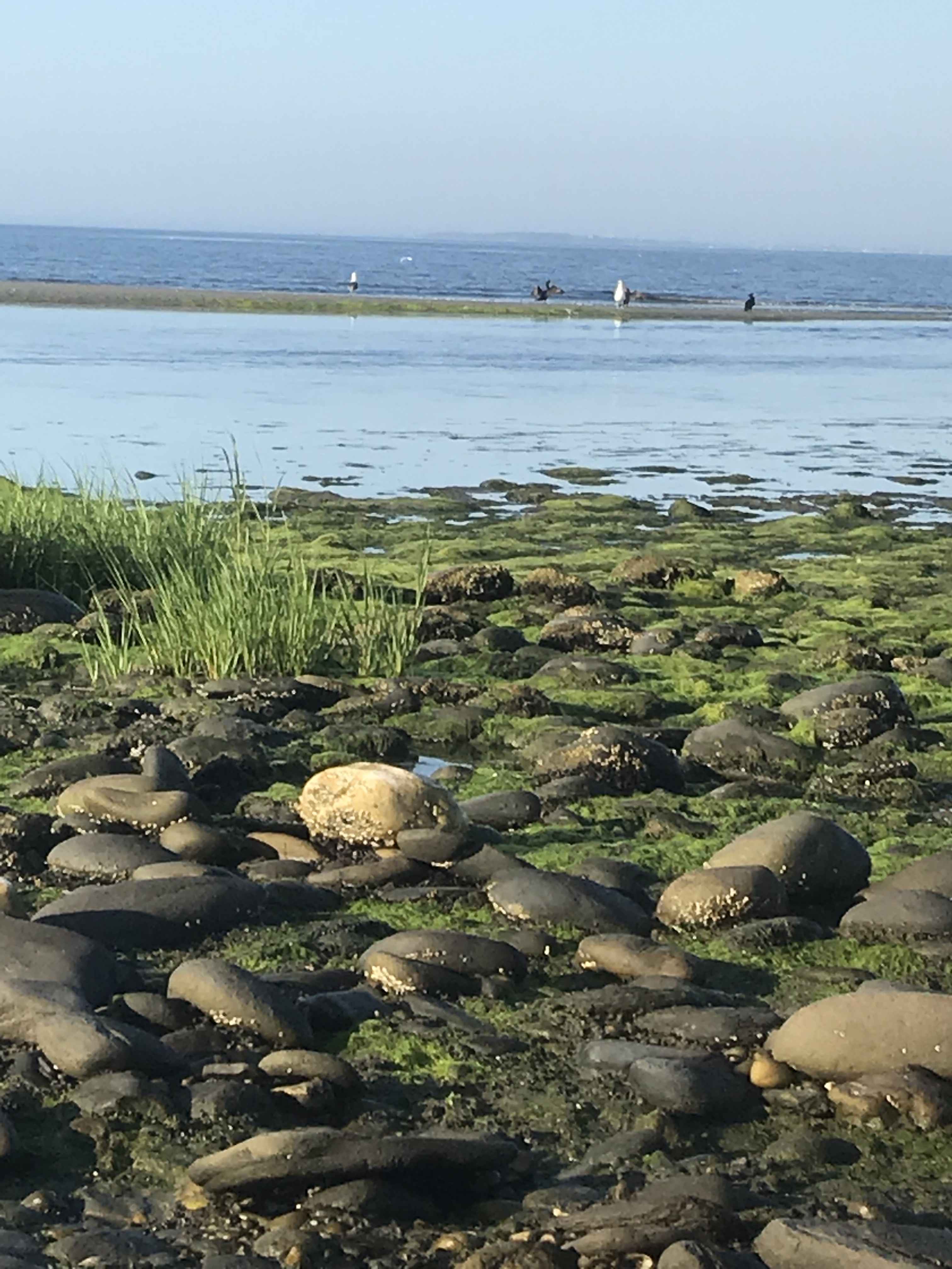 Where is everybody? The beach is so empty, one can imagine they are the sole survivor of some catastrophic event. If you overlook the obvious inconveniences and sorrows and loneliness such an event would incur, one could imagine a life of days floating on a tranquility that comes from within. A cleanness of mind derived from the absence of other human voices. Voices that all too often criss-cross over one another in conflict, hatred, and fear. The show is over. The lone survivor grabs her sandals and walks onward to the north end of the beach. The tide has delivered a bounty of ocean detritus. Piles of minuscule pink and orange shells glisten in the sun. There is less rock and more sand on this end of the beach. Barefoot walking is pleasant. Heels strike hard, damp sand, and the impact vibrates up through the spine and against the eardrum. The sound is hollow and scarcely perceptible. The sun cuts through the humidity and lays a its burning talons on the back of the neck. The survivor’s path swerves into the shallow water, seeking even the slightest hint of coolness to make the blazing heat more tolerable. Sweat beads form on her hairline and drip steadily down her face, her neck, into her ears. Up ahead, a set of giant rocks form a line into the water. A yellow sign stands in the sand, beckoning. Is it the end of the walk? Is it a warning? No, it states one is entering a nature preserve area. Foot traffic only. She walks on. The sand becomes powdery and deeper, dotted with single spikes of sea grass poking up here and there. There are tidal pools full of rocks, shells and seaweed. One could wade and find treasure. Maybe later. The beach comes to a point and turns a corner to the left. On the right, several sea birds lounge on a rock jetty. The ocean drowns out any sound they may make. For now, they are still life birds. They are a postcard-like backdrop to a random tuft of tall green grass.